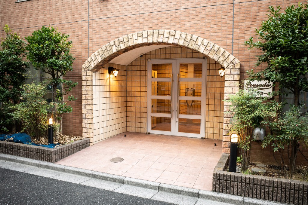 右手にレンガ色の建物が見えます。