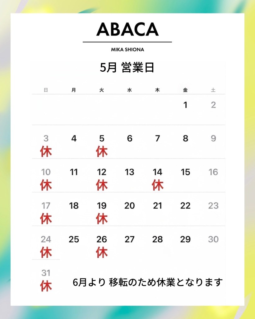 今のサロンでの営業は5月30日までとなります